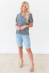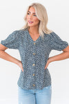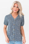 This new blouse is just blissful! We love the deep navy color, V-neckline, short sleeves with an elastic hem, functional buttons on the front of the blouse that make it nursing friendly, and the gorgeous dainty cream floral print throughout! You'll want this blouse for your summer wardrobe!