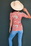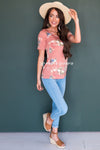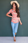 This is the perfect go-to top, and believe us when we say, this top is incredibly soft! Apricot top features a round neckline, half sleeves and a lovely mauve/blue floral print. Perfect for pairing with all of our skirts.
