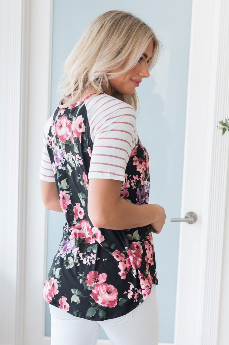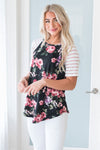 This cute and fun top is a must have for summer! Featuring striped baseball style sleeves and a pretty floral body. Made of the softest material to keep you comfy all day long!