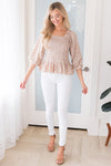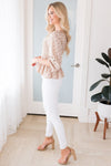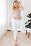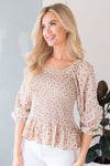 The Floral Visions Smocked Modest Blouse is a spring must have! This darling beige blouse features dainty tan floral print and a smocked peplum bodice for a beautiful feminine finishing touch. We simply adore it, and we're sure you will too!