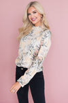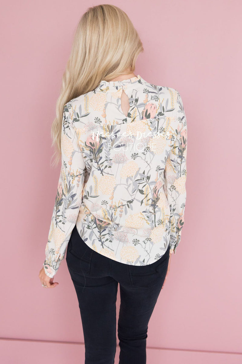 This delicate classy floral blouse is perfect day or night! Featuring lovely flower garden pattern with the most darling neutral tones for any outfit! Also features a modest ruffled collar neckline and long cuffed ruffles sleeves. Get yours today before they are gone!