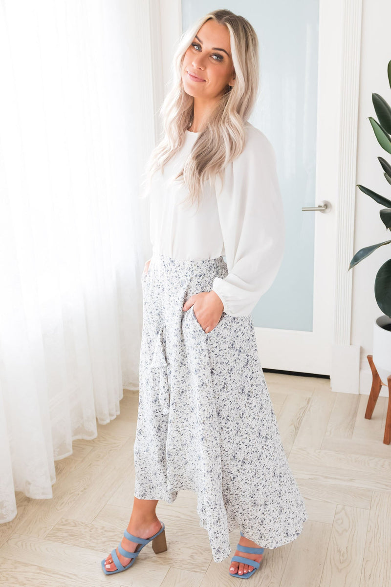 This gorgeous ruffled midi skirt is a closet must-have! The spring floral color scheme couldn't be more perfect! We love the white color, blue and grey floral throughout, elastic waistband, and tiered high-low ruffle skirt! This stunning skirt will sell out quick so get yours soon!