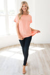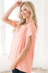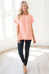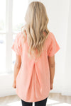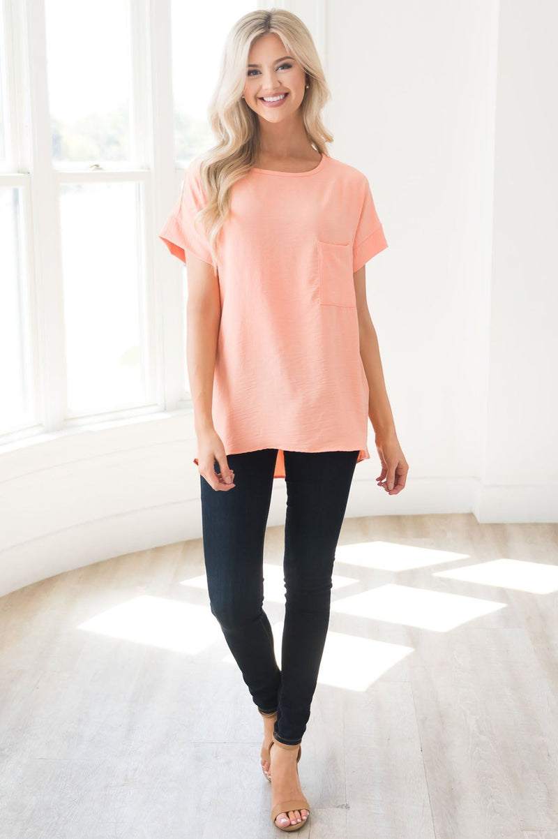The Happiest Moments Modest Hi-Low Blouse is just gorgeous! This bright peach top features cuffed short sleeves, a hi-low hem, lightweight material, a pleated back, and a front pocket. This adorable blouse is a must have for summer!!