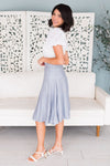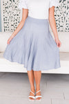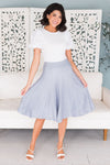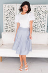 Say hello to the most darling modest skirt you will ever own! We are loving the flattering silver color with x inlay pattern. The fit and flare style is a must have for any body shape! Get yours today!