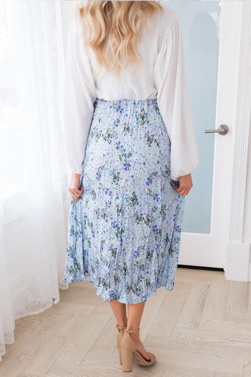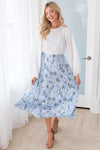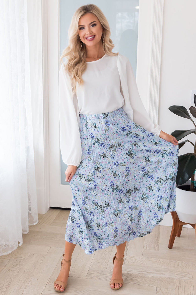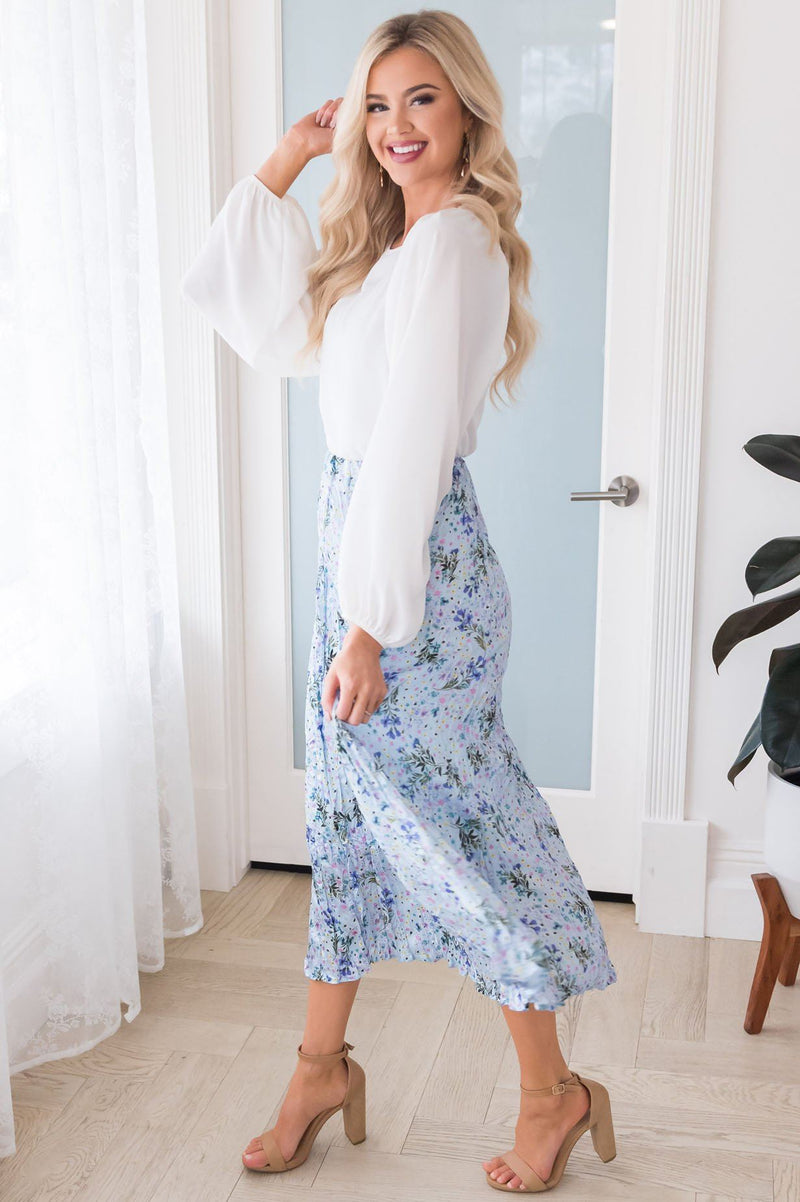 This beautiful and feminine skirt is perfect for spring! The pleaded waist line allows for a flattering and modest fit! The floral pattern is full of all your favorite spring colors too! We are just obsessed over this dreamy satin skirt!