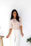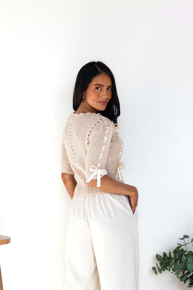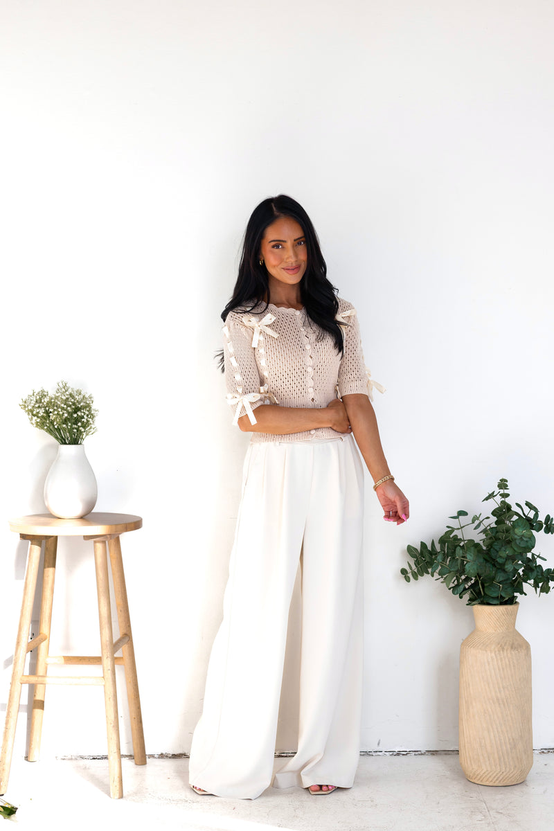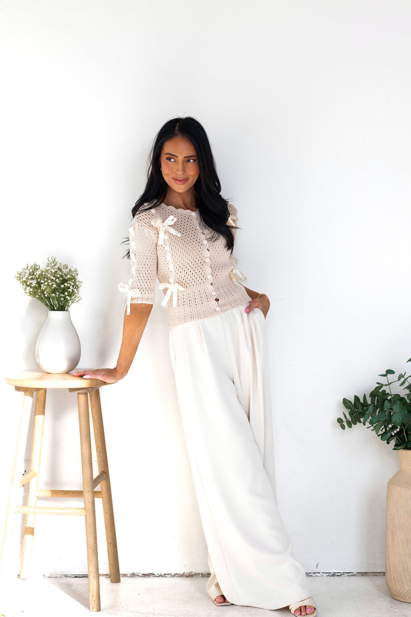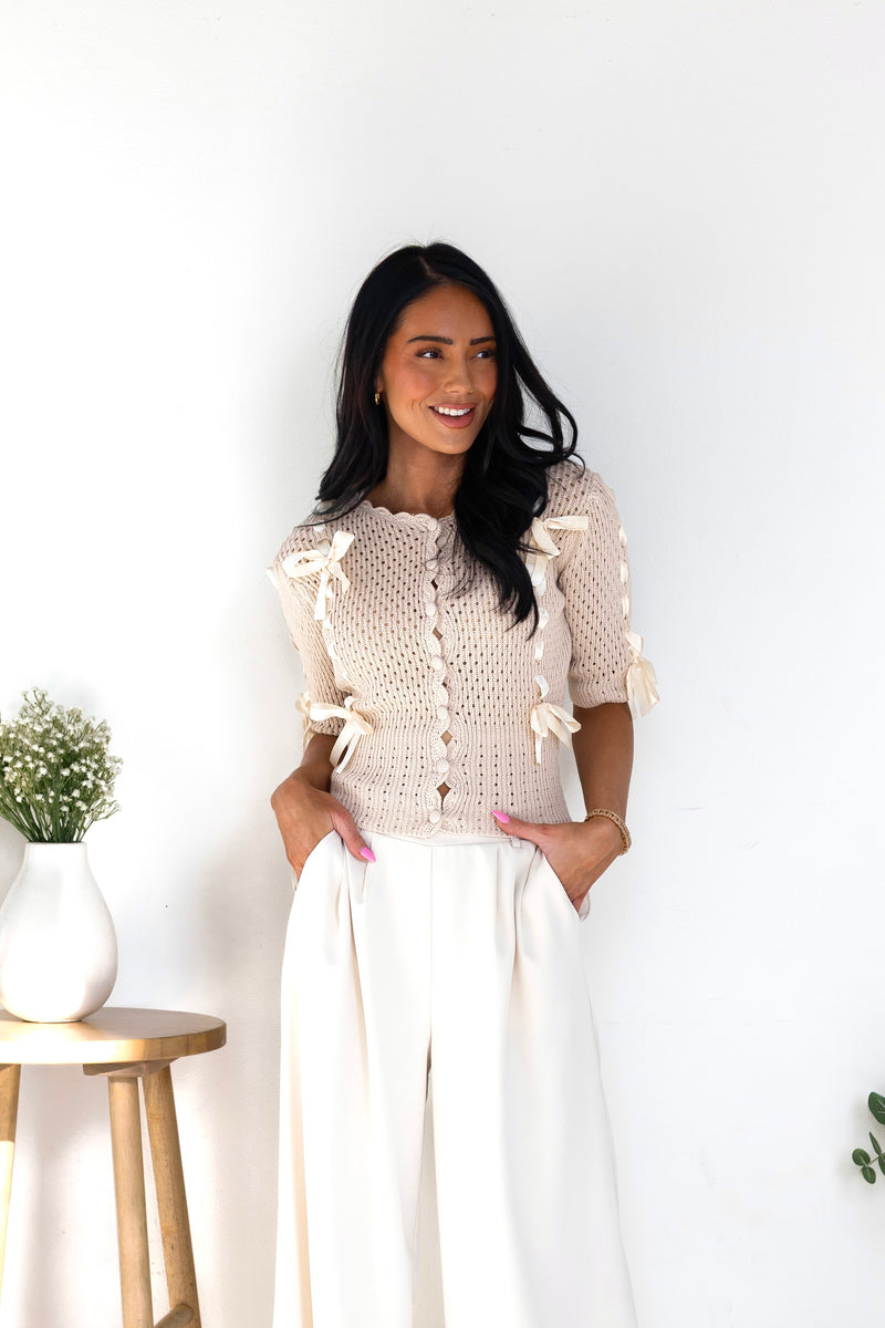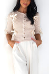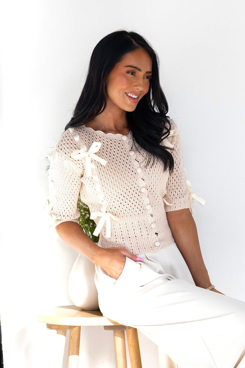 We love our new Happy State Of Mind Knit Sweater! It is so classy yet playful, we have never seen anything this cutie! It features a gorgeous ecru color with an irresistibly cute satin bow detailing, functional button front and half length sleeves. This is sure to sell out, so hurry and get your perfect for Easter sweater today!