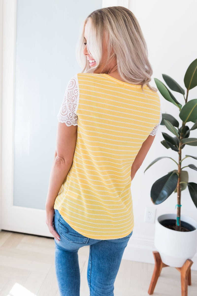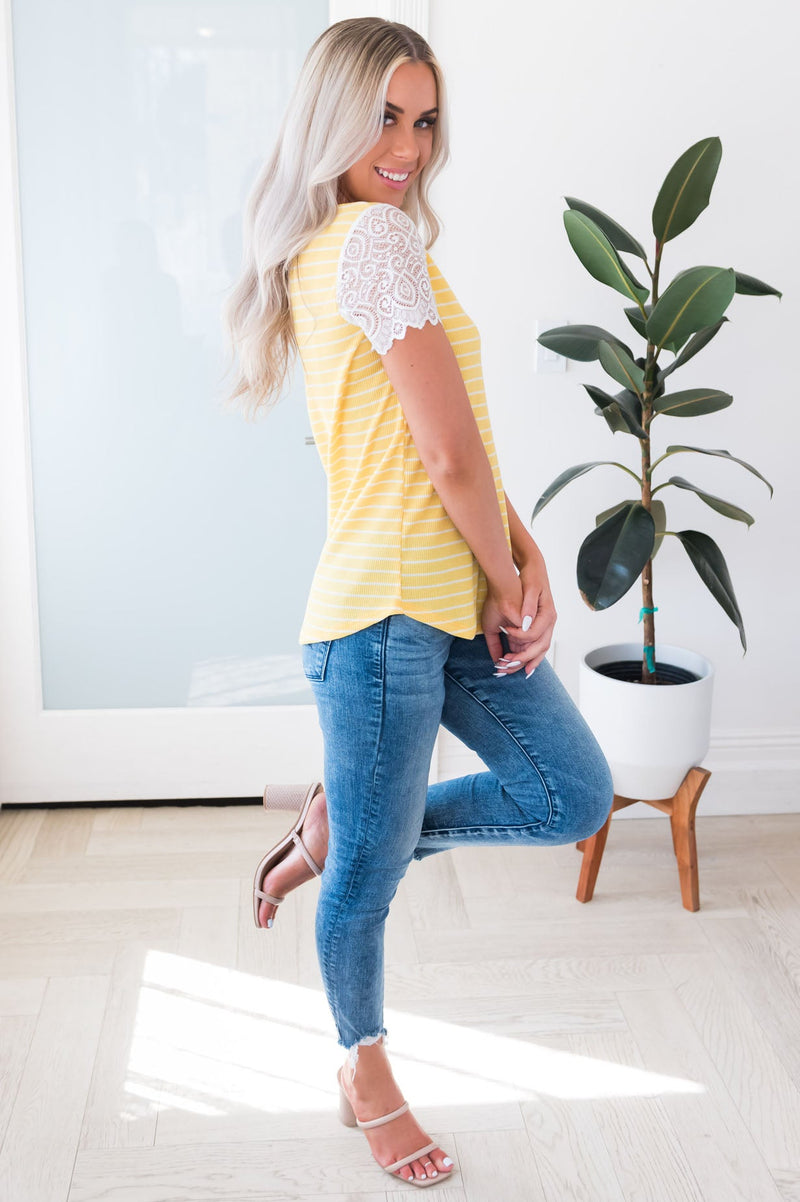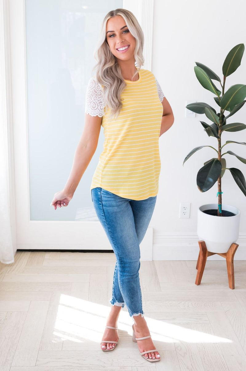 The Have A Little Faith Modest Top has swooped in and stolen our heart! We are obsessed with the darling lace sleeves and striped fabric. Get yours today, these beauties won't last for long!