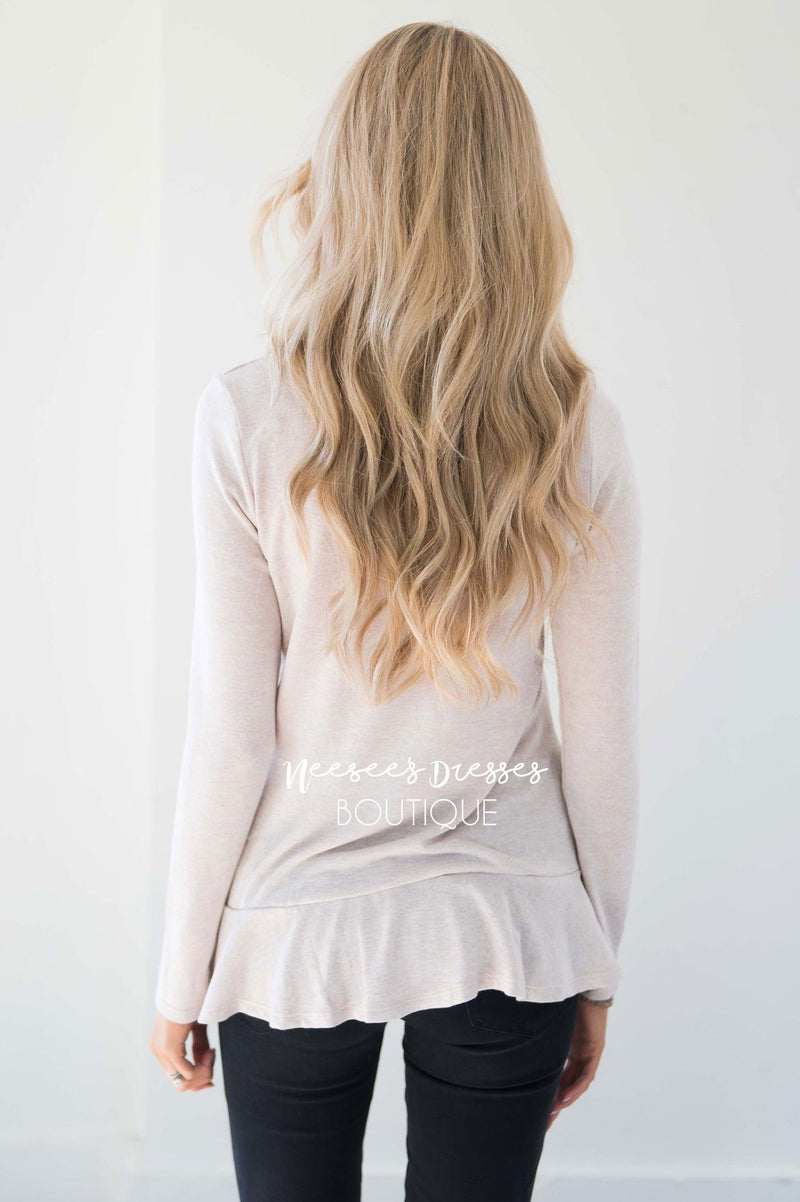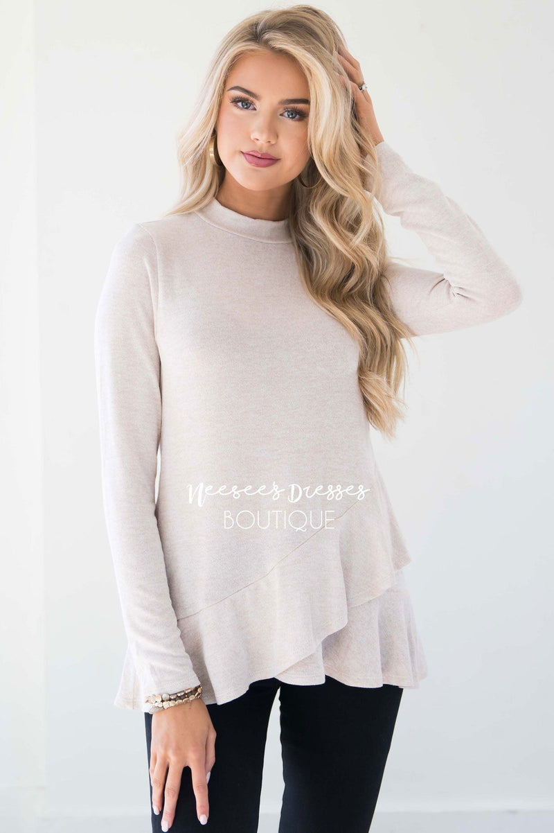 You can never have too many sweaters for fall and winter! Are we right?! This soft as can be heather cream sweater features high neckline and double ruffle hem.