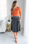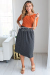 Spice up your date night attire with this adorable tea length skirt! Featuring an elastic waistband, & the cutest pinstripe detailing ever, this skirt will be turning heads for sure! This skirt also comes fully lined, which is always an added plus! Make sure you get it before it is all gone!