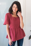 Grab this cute new arrival quick! We are obsessed with this new brick red blouse, it has the most amazing features! Some of these features include a square neckline, half length flutter sleeves, a peplum style bodice, and wavy embroidery on the front of the blouse! Get yours before they're gone!
