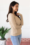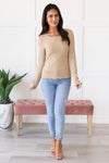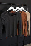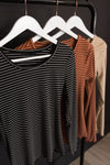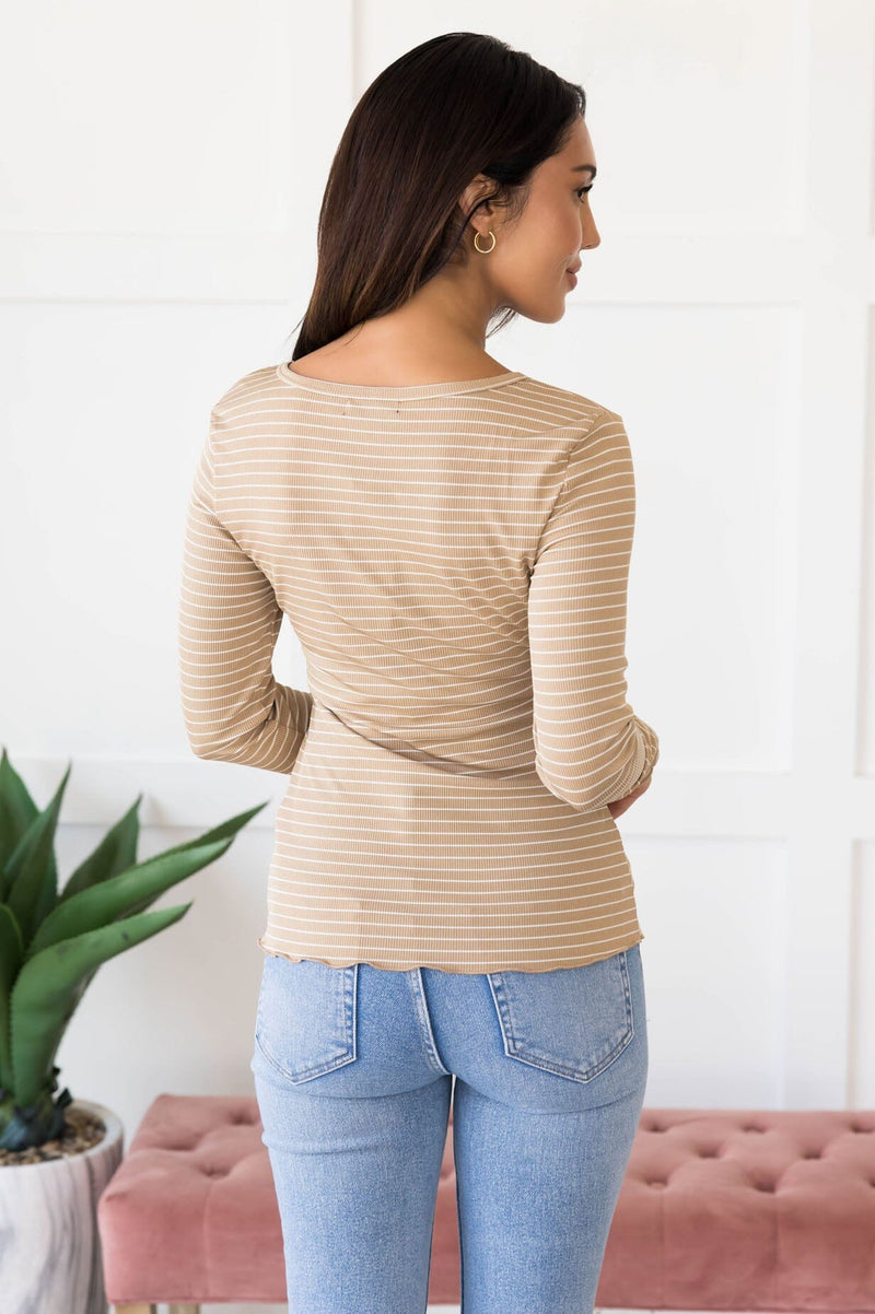 This delicate ribbed top is perfect day or night! Featuring gorgeous striped color combo that creates the softest feminine touch, long sleeves with delicate lettuce edge hem on the sleeves and hemline. This top pairs so well with everything, try it with one of our jumper dresses for a cute and classic pairing!