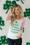 Shop our collection of the cutest St. Patrick's Day tops! "Irish Kisses Shamrock Wishes" white top with a light pink stripe sleeves.