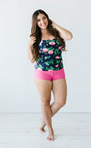 This cute swim tankini top is a deep purple and features a pretty pink rose floral print.