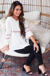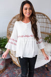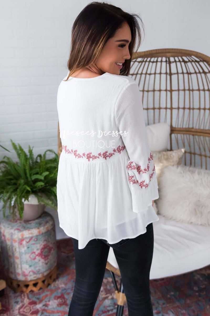We are turning heads this winter/spring in this stunning new blouse! Featuring the perfect combination of ivory with soft coral embroidered details, this blouse is absolute perfection! Featuring a flowy flounce sleeve, a rounded neck line with a button down front and a baby doll waist line. This blouse is also lined.