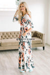 Our super soft floral dresses just got a make over! Now coming in floor length, this maxi dress is as pretty and comfortable as they come! Ivory maxi dress features a pink, black and mint watercolor floral print, elastic waist, 3/4 length sleeves and your favorite: front pockets!