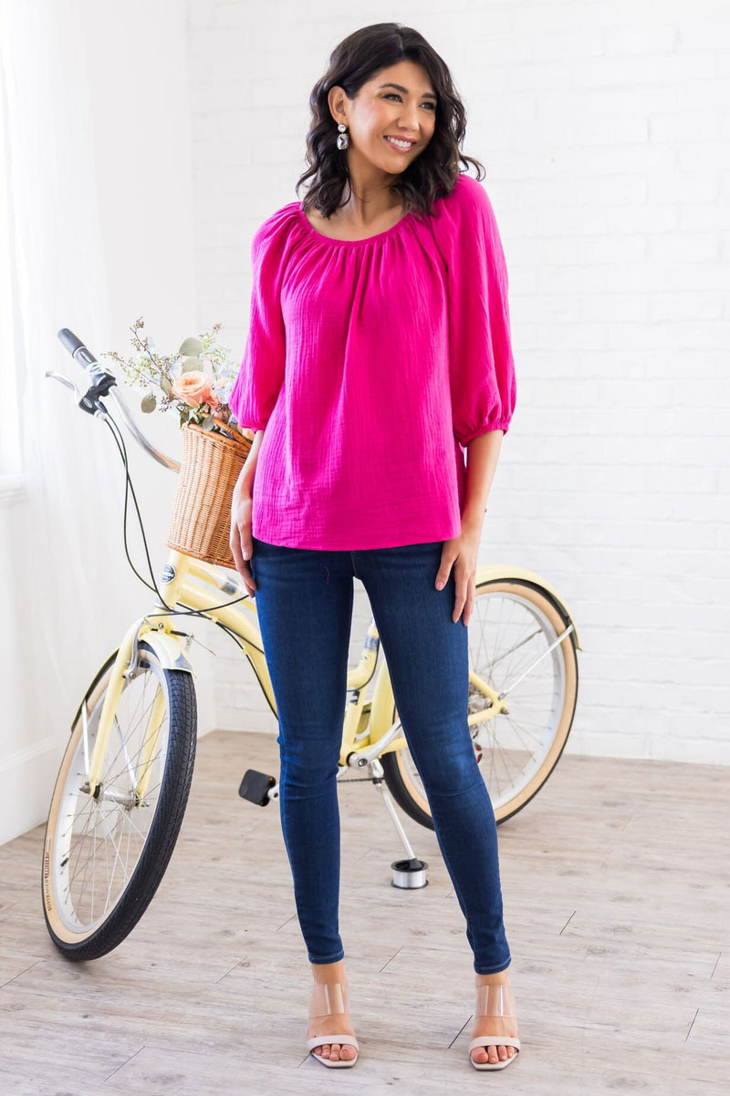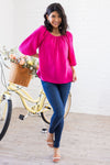 The new Joy Abounds top is so stylish for all! Features the perfect match for everything! Featuring a flattering textured fabric, quarter length sleeves and an oh so gorgeous fuchsia color! Gets yours today because this match friendly beauty will go quick!