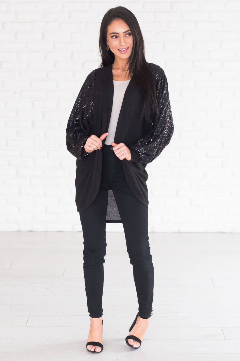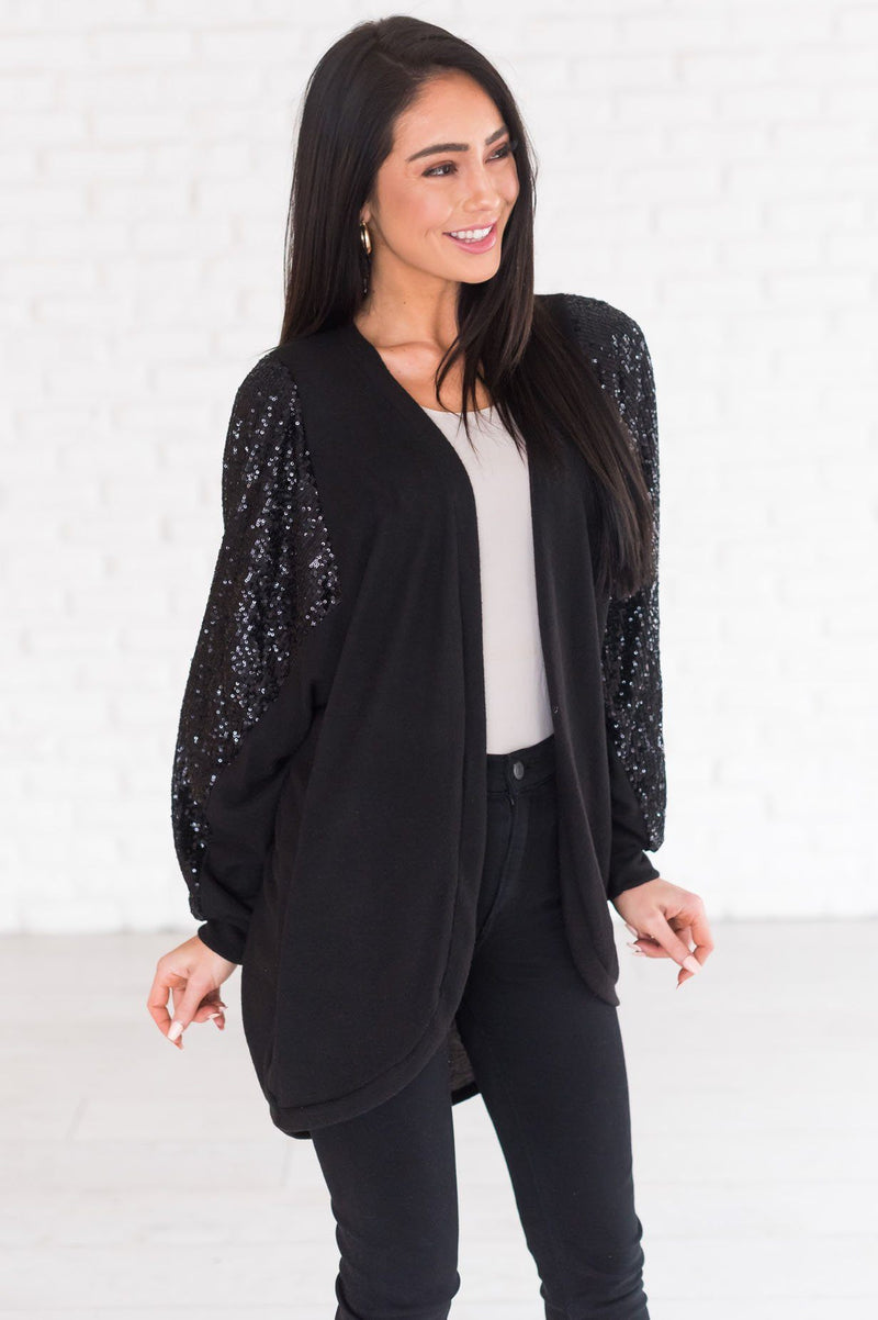 This gorgeous cardigan is perfect for the chilly days! If you are looking for the perfect piece to add to your wardrobe, look no further! We promise this is going to be the perfect one for you. It features super soft material with the perfect pop of sequined bling on the sleeves! Trust us, you are going to love this one and its stylish cozy feel and fit!