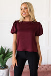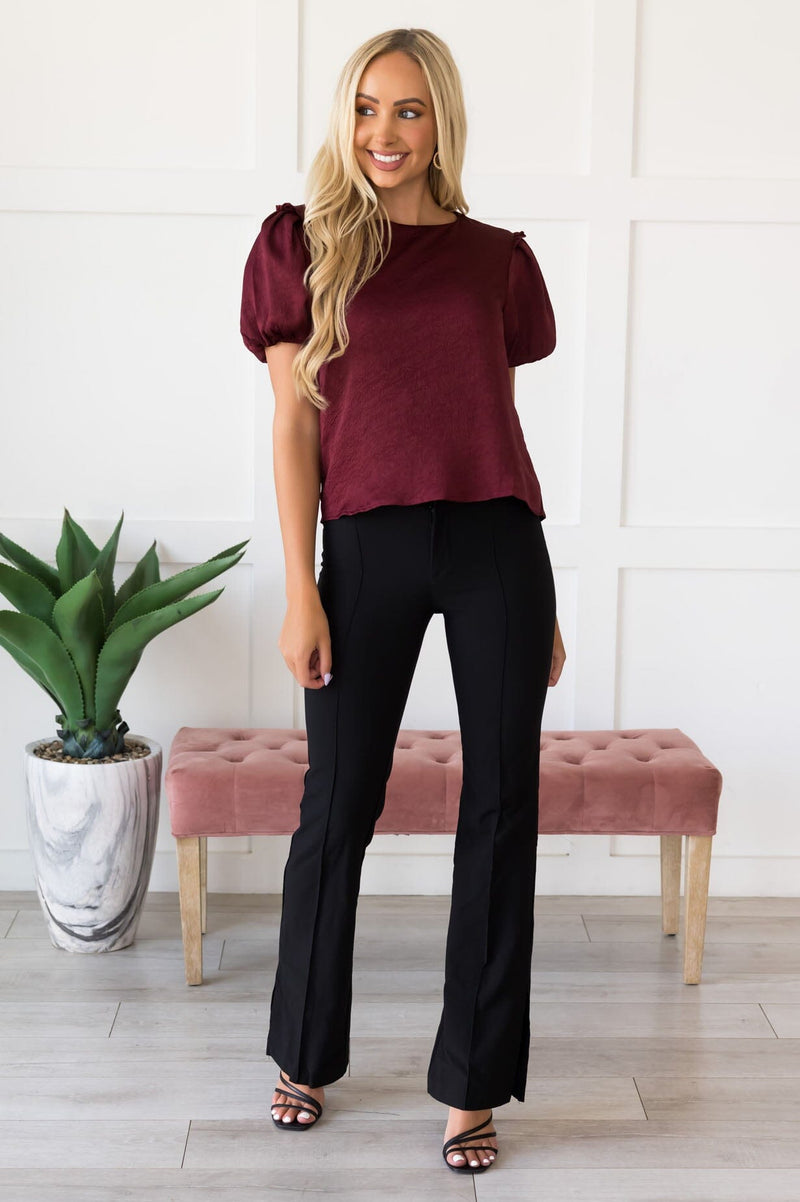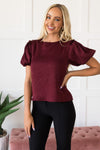 This feminine ruffled puff sleeve top is perfect day or night! Featuring gorgeous merlot colored crinkle fabric, modest round neckline and flattering fit. This blouse pairs so well with everything, get yours today!