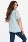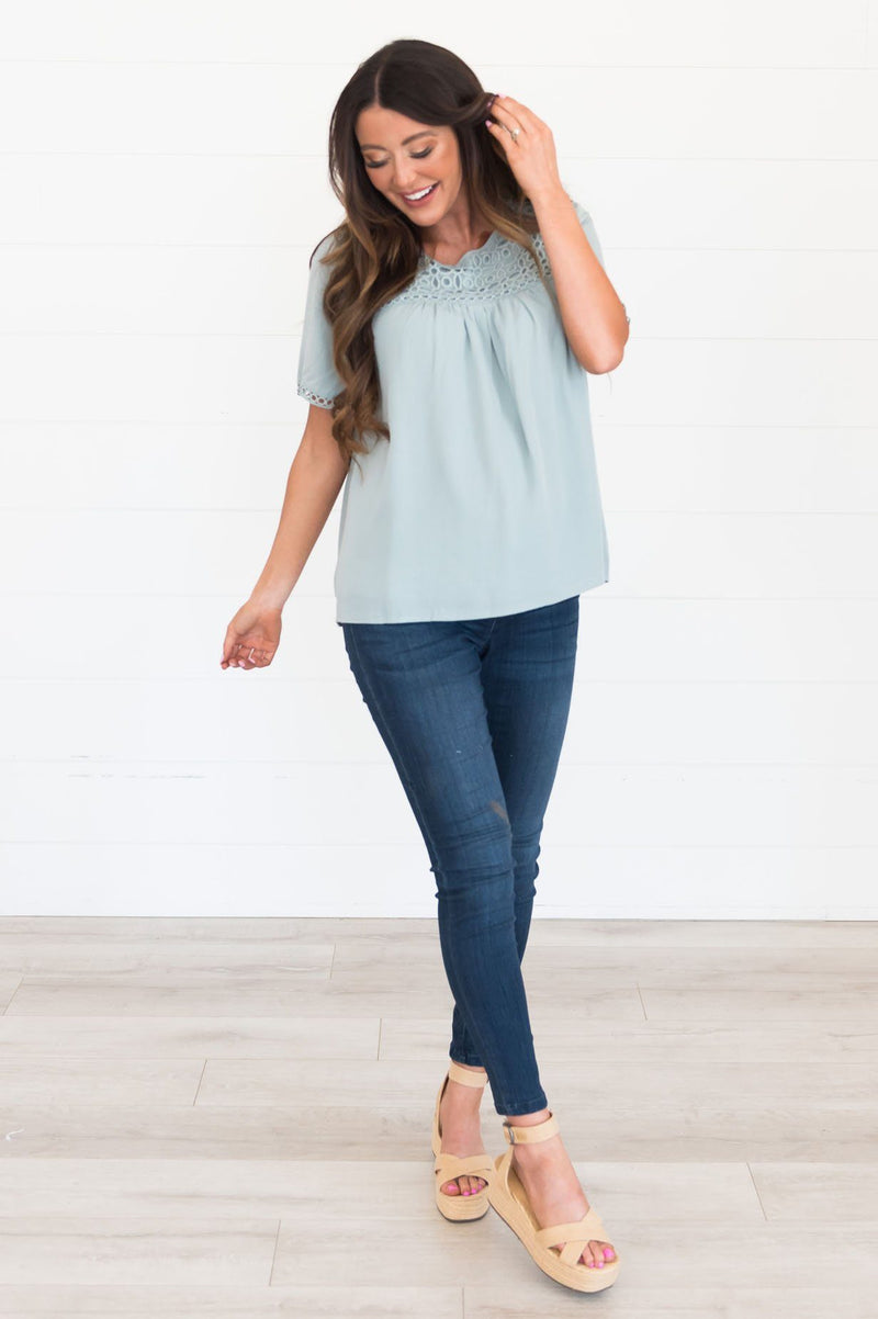 Wow! We are obsessed with the new Keep it Sweet Modest Blouse! This dusty light blue blouse has the most amazing features, including a rounded neckline, half sleeves, and eyelet embroidery on the top of the bodice and sleeves! It also has a functional button at the top back of the neck to clasp it together. Get this gorgeous blouse soon before its gone!
