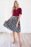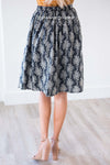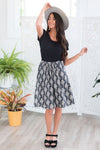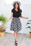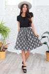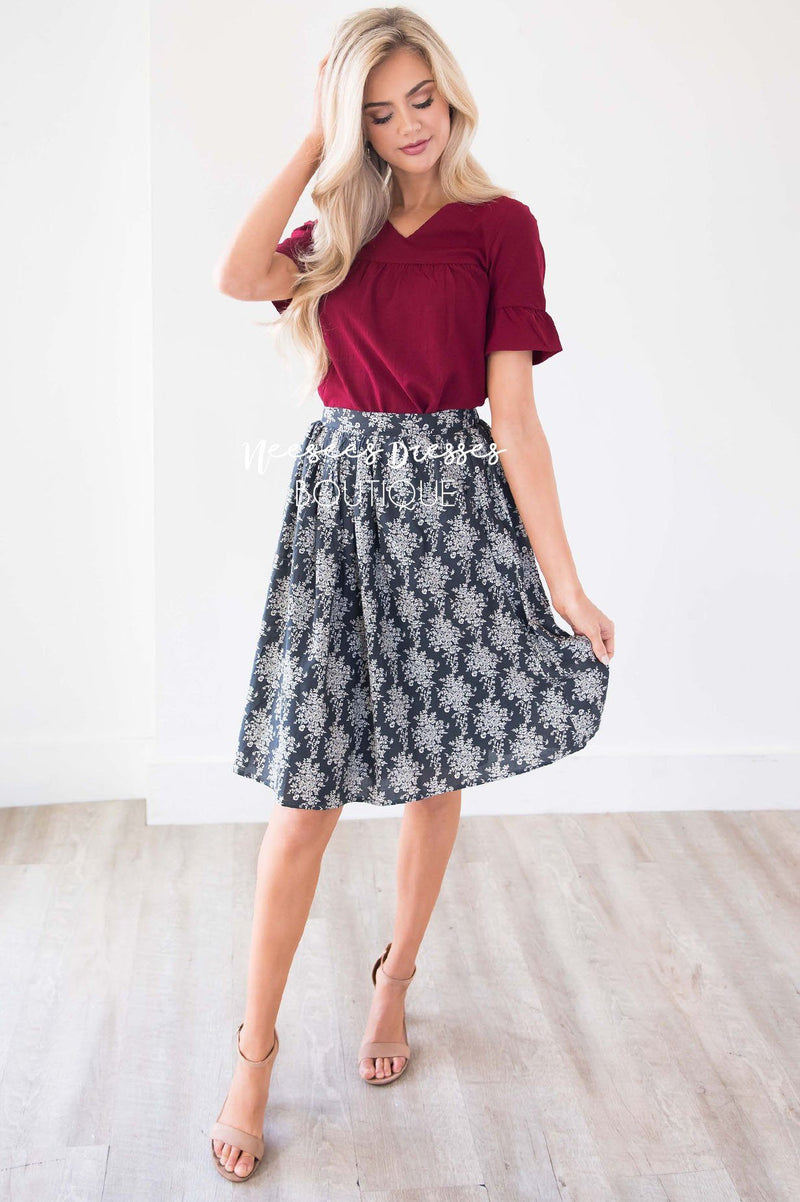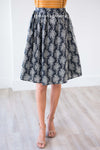 This beautiful floral skirt is such a trend and fun way to welcome these breezy fall days! Featuring a deep charcoal color with an ivory damask floral print, a fitted stretch waist band and a full circle skirt.