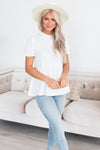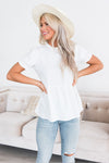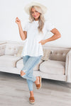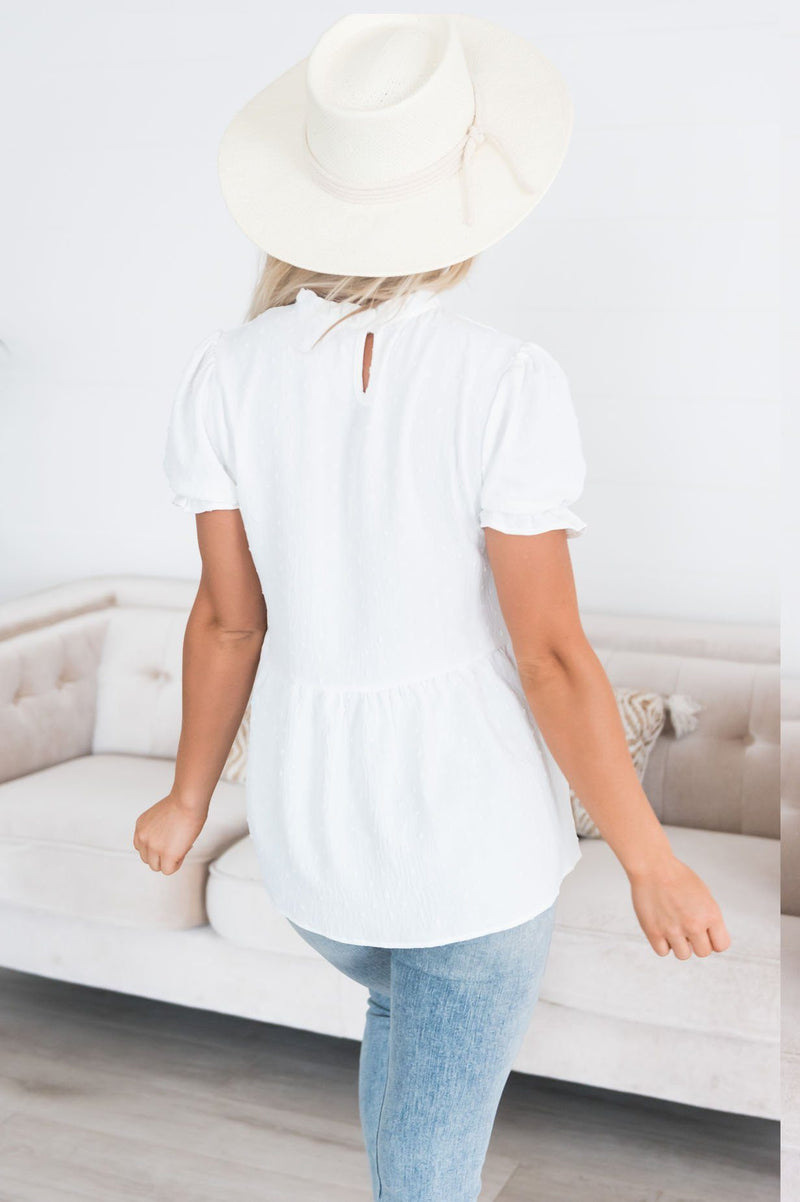 Your new favorite modest blouse is here! We just love how versatile this blouse pairs with just about anything. Featuring a high ruffle neckline, keyhole button back neck ,short sleeves with a ruffled hem, swiss dot texture, and a beautiful cloud white color! This one is surely a must have!