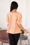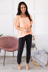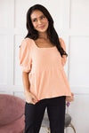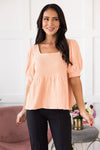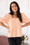 Talk about spot on modest fashion! This darling ribbed blouse is bound to be the perfect addition to your wardrobe! Soft flowy peplum style with short puff sleeves the the most darling dusty peach color!