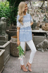 This adorable top will not last long! It is flattering, comfortable and has the cutest details. This top features half lace sleeves with an eyelet detail, chambray blue and cream stripes bodice and the cutest lace waist detail!