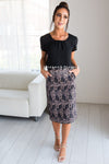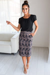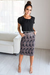 This darling pencil skirt is to die for! We love the charcoal lace print design atop the nude background. Also features pockets and a back zipper closure.