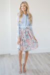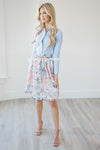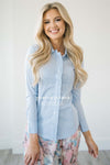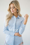 Talk about adorable, we are obsessed with this new top! Light blue and white pinstripe top features buttons up the front with a cute ruffle detail.