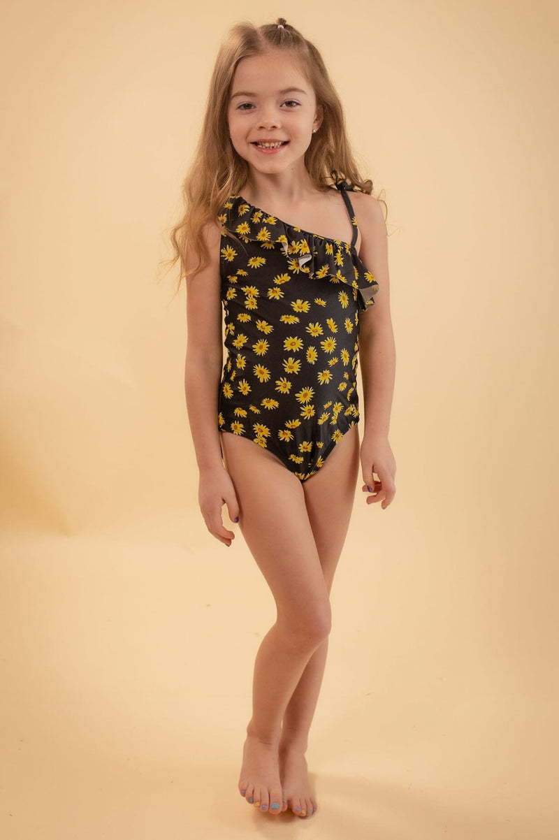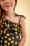Get ready to shine bright! This sweet little one piece is so fun and cheery! We simply can not get enough of this modest ruffled shoulder and tie strap paired with the cute sunflower print, get yours today!