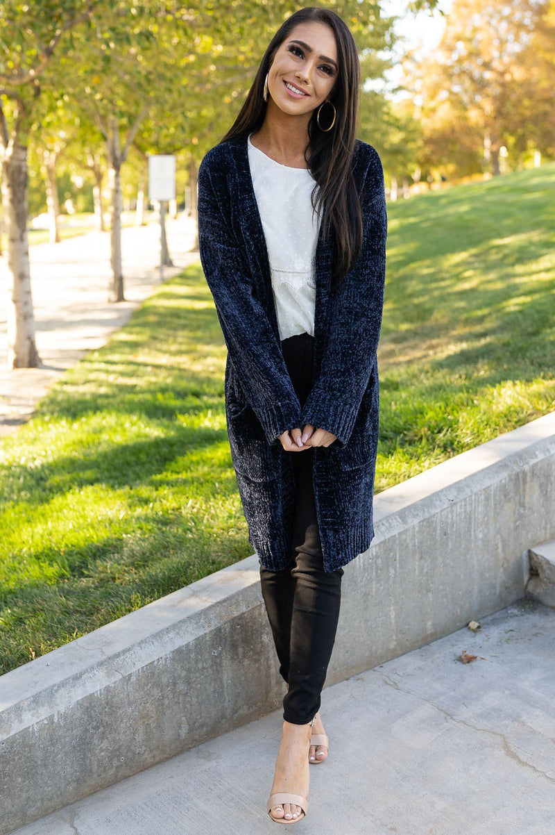 This gorgeous cardigan is perfect for the chilly days! If you are looking for the perfect sweater to add to your wardrobe, look no further! It features super soft chenille material, long oversized fit and beautiful rich navy chenille. Trust us, you are going to love this one and its cozy feel and fit!