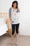 Looking for that perfect comfy, casual fun floral top? Look no further because we have the one for you! That's right your eyes aren't playing tricks on you! Featuring 3/4 length sleeves, casual fit, modest round neckline and the most perfect contrasting ivory floral bodice and navy striped sleeves around!