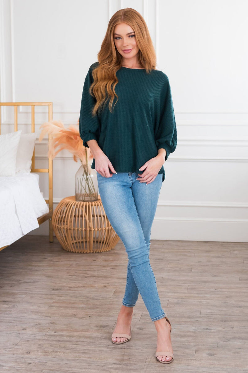 The Love Is Never Lost Modest sweater is the perfect top for every outfit!! The beautifully soft brushed waffle fabric, quarter length cuffed sleeves, and classy teal color, we simply can not get enough of it! Make sure to get yours today!