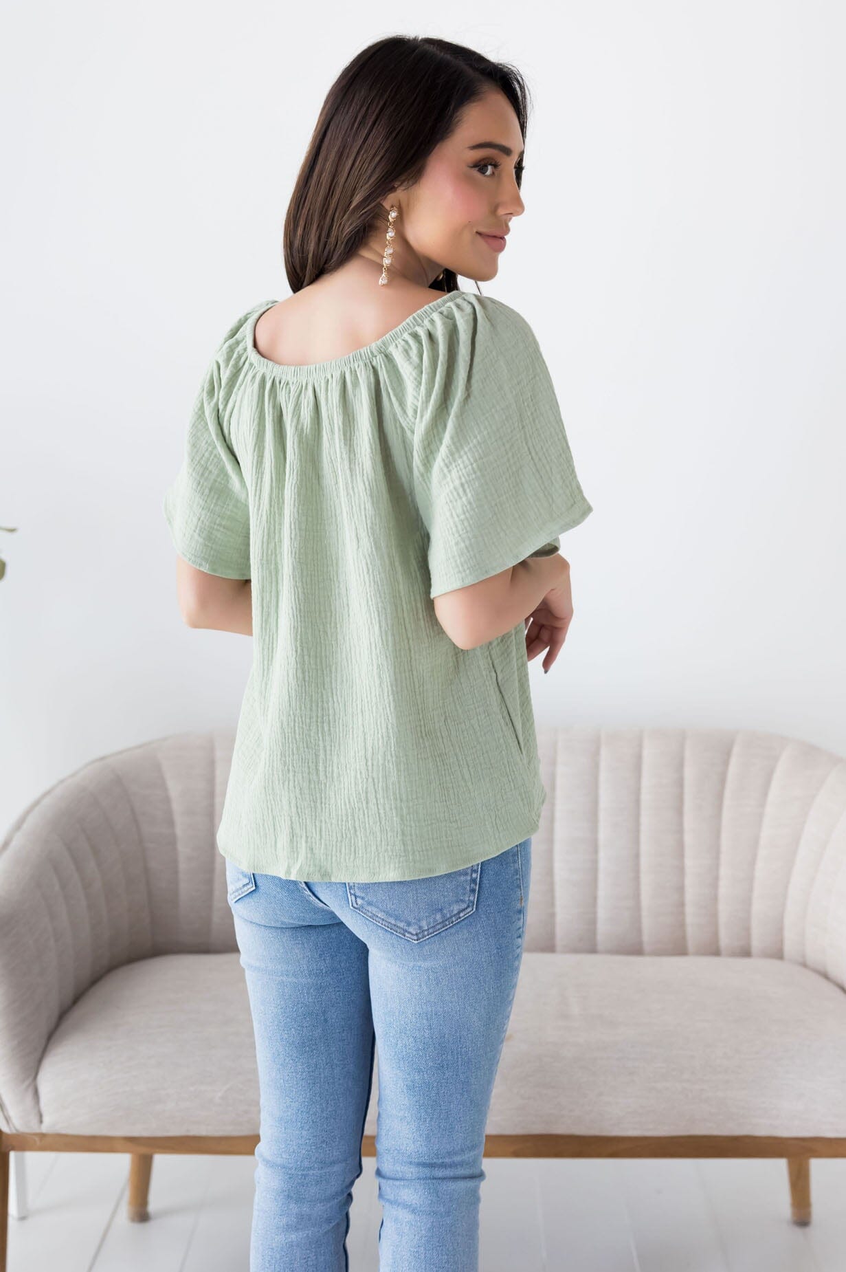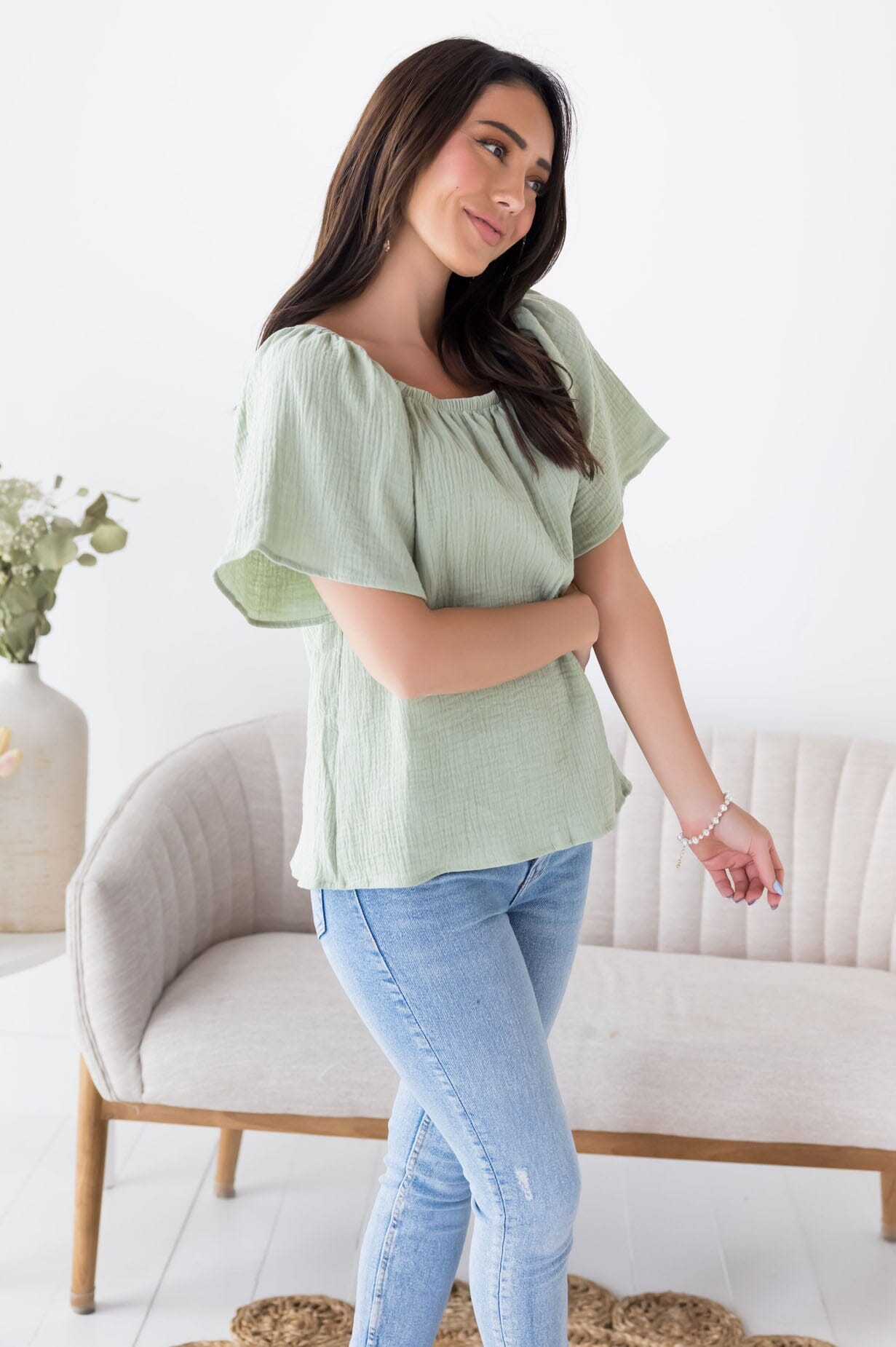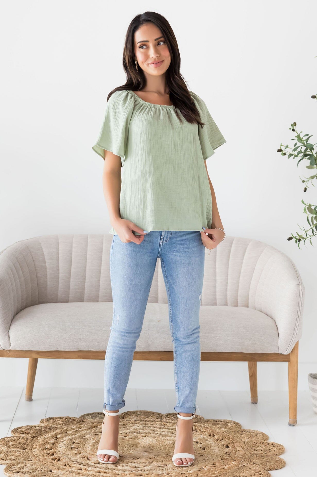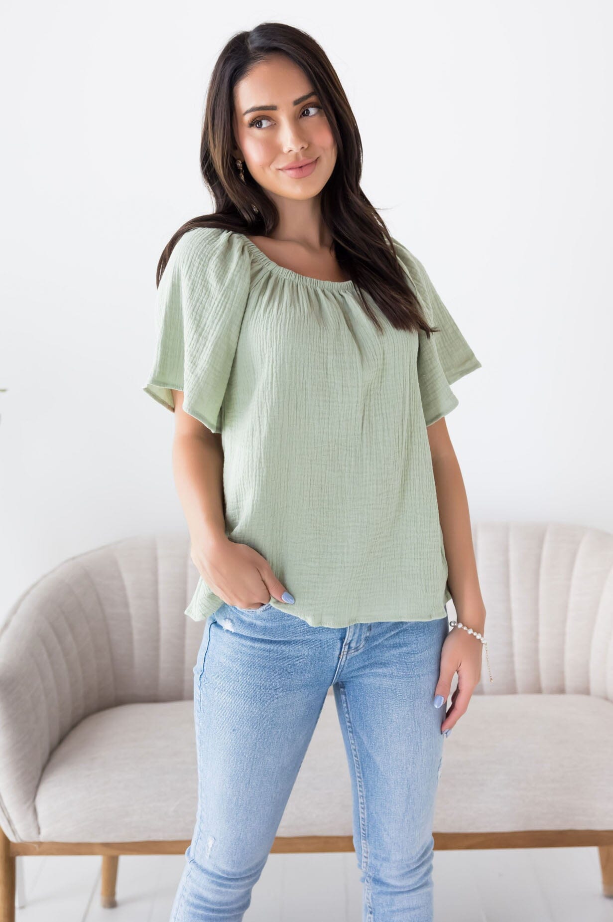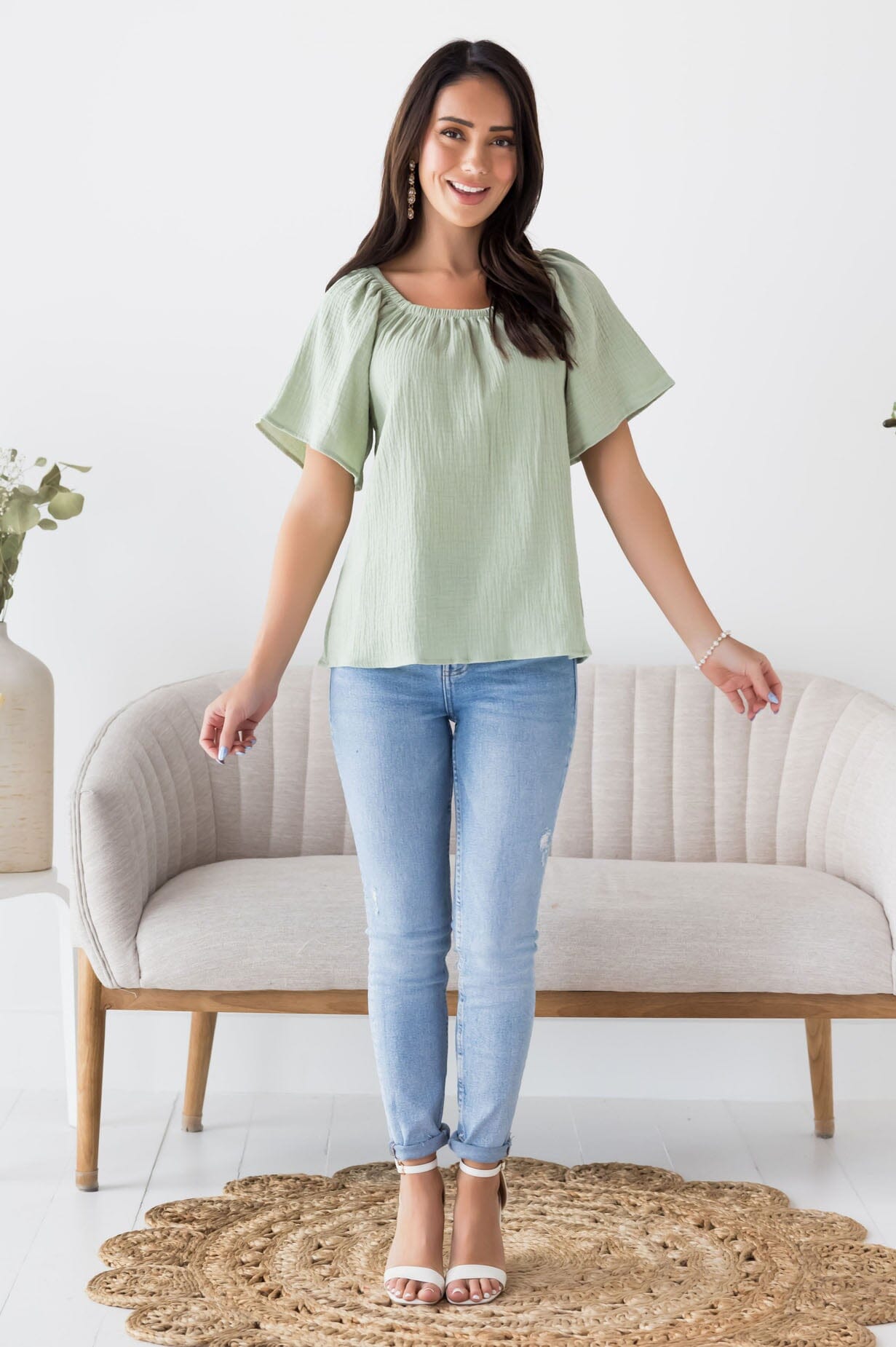 The new Lovely Lessons blouse is so stylish for all! Features the perfect match for everything! Featuring a gorgeous textured fabric, short flutter sleeves and an oh so flattering fit! Gets yours today because this match friendly beauty will go quick!