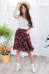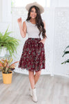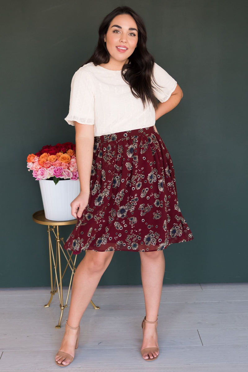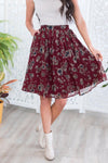 Add the perfect touch to your spring wardrobe with this new floral skirt! This burgundy floral is such a chic way to add a little flair to any occasion! Burgundy skirt features a darling burgundy cluster floral print, a fitted waistband, side pockets and is fully lined.