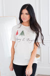 We've got your new favorite tee! Featuring unbelievably soft material, the cutest merry and bright with Christmas trees graphic around and short sleeves. This is your new modest feminine t-shirt go to! Get yours today!
