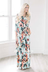Our super soft floral dresses just got a make over! Now coming in floor length, this maxi dress is as pretty and comfortable as they come! Pretty mint maxi dress features a watercolor floral print, elastic waist, 3/4 length sleeves and your favorite: front pockets!