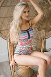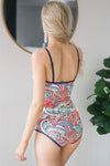 Twin print swimsuit with contrast binding trim Cami style, adjustable straps Shelf bra with removable cups Fully lined Nylon/Spandex microfiber swim fabric