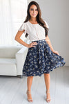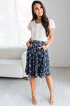This skirt is oh-so-beautiful, plus it has pockets, you cannot go wrong! We promise you are going to love this in your fall wardrobe! Navy skirt features a fall floral print, a gathered waist, side seam pockets and side zipper closure. Back of skirt as elastic waist and skirt is fully lined.