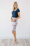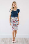 The perfect, go-to blouse! This beautiful navy chiffon top features a gathered neckline and cute tulip sleeves. Perfect for pairing with all of your skirts!