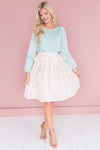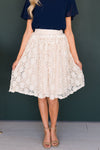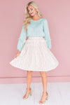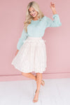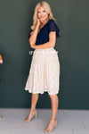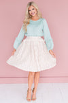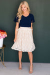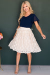 WOW! Add this perfect NEW skirt to your cart today! We love the textured overlay, the elastic waist, and that it comes full lined! We can not say enough good things about this one!