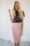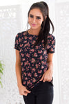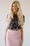 This is the perfect go-to top, so gorgeous and feminine! Navy top features a round neckline, half sleeves and a lovely rose floral print. Perfect for pairing with all of our skirts.