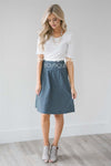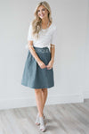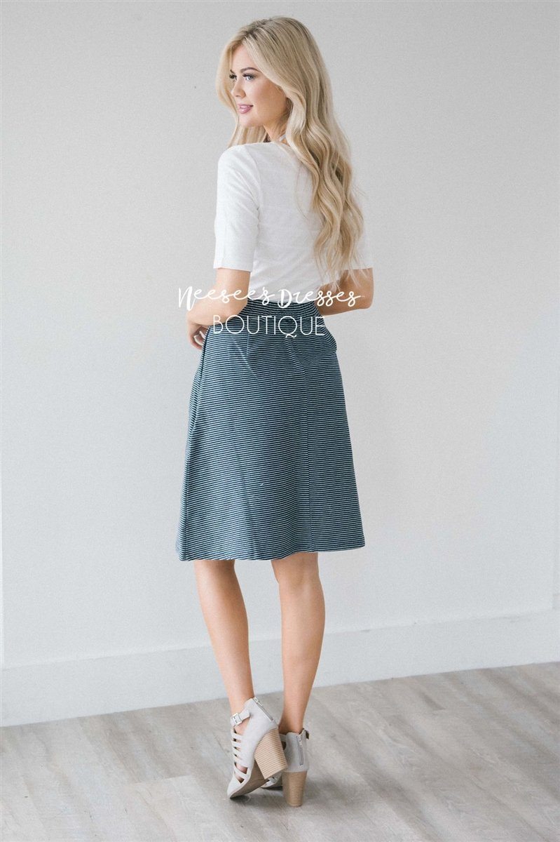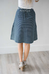 We have found the perfect striped skirt! This navy skirt features an a-line fit skirt, an elastic waist band, thin white stripes, side pocktes and wide pleats. This beautiful skirt is also fully lined!