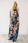 Our super soft floral dresses just got a make over! Now coming in floor length, this maxi dress is as pretty and comfortable as they come! Navy maxi dress features a pretty watercolor floral print, elastic waist, 3/4 length sleeves and your favorite: front pockets! Belt and accessories not included.