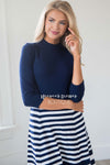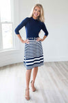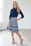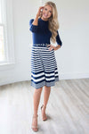 Hands down, one of our new favorite dress! From the fit to the classic navy and white, this dress is as beautiful as they come! This sweater knit dress features a navy bodice, high neckline, 3/4 length sleeves and a navy and white striped a-line skirt.