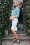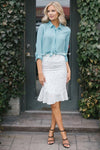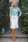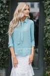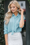 This new top features a dusty blue color, a button front, a collar with a detachable neck tie and roll tab long sleeves!