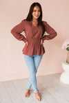 We are absolutely over the moon excited to share this top with you! Classy clay color will pair perfectly with anything! Featuring the most darling cuffed long sleeves & soft v-neckline, with a smocked waistline and a flowy peplum fit. Get yours today!