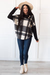 Ready for your new favorite fall top!? This gorgeous plaid dolman sleeve poncho-like top has a darling button detailed neckline, a black, & ivory plaid and black long sleeves! The Nice & Cozy top is the perfect addition to your fall wardrobe!