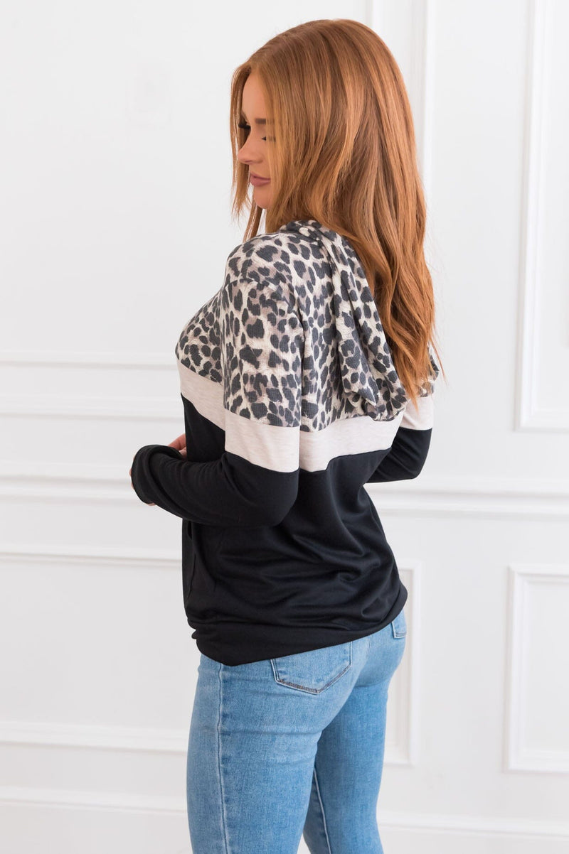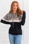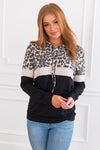 Hey, you, yes, you! You need this adorably cozy lightweight hoodie! Trust us! Featuring lovely block leopard print with the perfect contrast in grey & taupe. We are also loving the hood & drawstring detail & front kangaroo pocket!