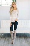 It doesn't get any cuter than this top, it is absolutely perfect for casual fall days or for pairing with your favorite skirts on Sunday. Oatmeal top features a suede bodice and shimmery trim around the neck with baseball style sleeves.